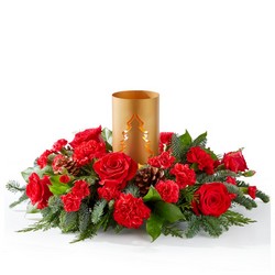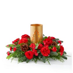 Add blustery cheer to any holiday table with this coniferous centerpiece studded with cardinal–red flowers gathered around a glowing candlelit tree lantern.