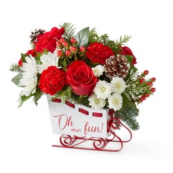 Sled into the holiday season with this lush arrangement of red roses, carnations and fragrant greens. This keepsake sleigh is perfect for a centerpiece, party dcor, hostess gifts, or to send holiday wishes to those far away!