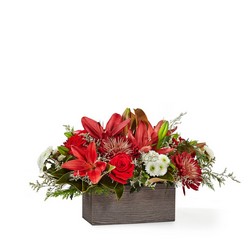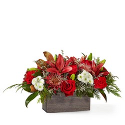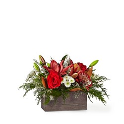 Take a break from the holiday festivities with this seasonal arrangement of red roses, mums, and lilies, perfectly accent by christmas greens. This gift is perfect for uplifting spirits, sending holiday greetings, a birthday wish or a honoring a memorable day.