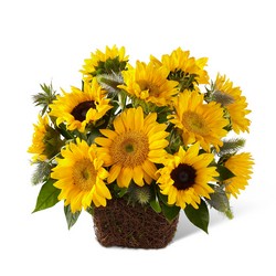Bold, full of energy and light, and ready to brighten your recipient's day, this gorgeous flower bouquet has been arranged just for you to help you create a special moment they will never forget. Sunflowers and mini sunflowers are the stars of this flower arrangement showcasing both yellow and brown centers to add interest and texture. Accented with sea holly stems and an assortment of lush greens while situated in a vine and moss planter to give it a rustic edge that is trend forward and altogether stunning, this unique flower arrangement is set to celebrate a birthday, express your thanks and gratitude, or offer your congratulations wishes. GOOD bouquet includes 7 stems. Approx. 12"H x 12"W. BETTER bouquet includes 11 stems. Approx. 14"H x 14"W. BEST bouquet includes 15 stems. Approx. 15"H x 15"W. EXQUISITE bouquet includes 20 stems. Approx. 16"H x 16"W.
