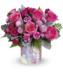 Everything's rosy! Make their day sparkle with this perfect pink rose bouquet and keepsake mosaic glass vase that sparkles in a shimmering soft shade of pink.