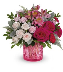 Take their Valentine's Day breath away with this stylish pink rose bouquet, presented in an artisanal mosaic vase of stained glass that swirls in stunning shades of pink.