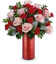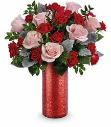 Make a stunning statement this Valentine's Day with this modern mix of pink roses and red spray roses arranged in a dazzling red sparkle glass vase that radiates passion and confidence.
